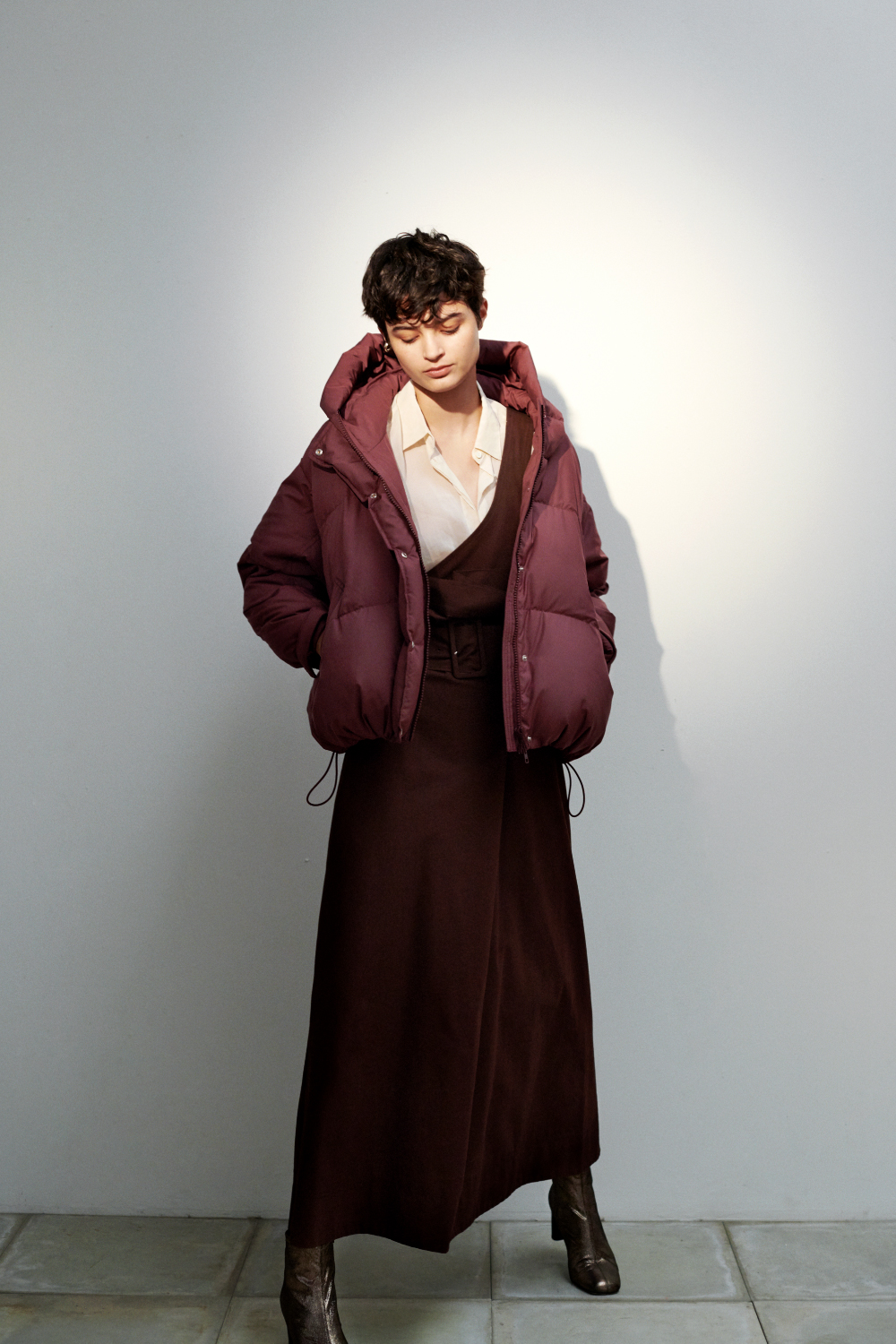 イタリア「LIMONTA」社の上質な生地を使用したショートダウン。 マットな質感の素材を使用し、 ルーズに見せない程よいボリューム感がカジュアル過ぎず大人な印象に。 今シーズンは、ロング丈のアイテムとのスタイリングバランスもお勧め。