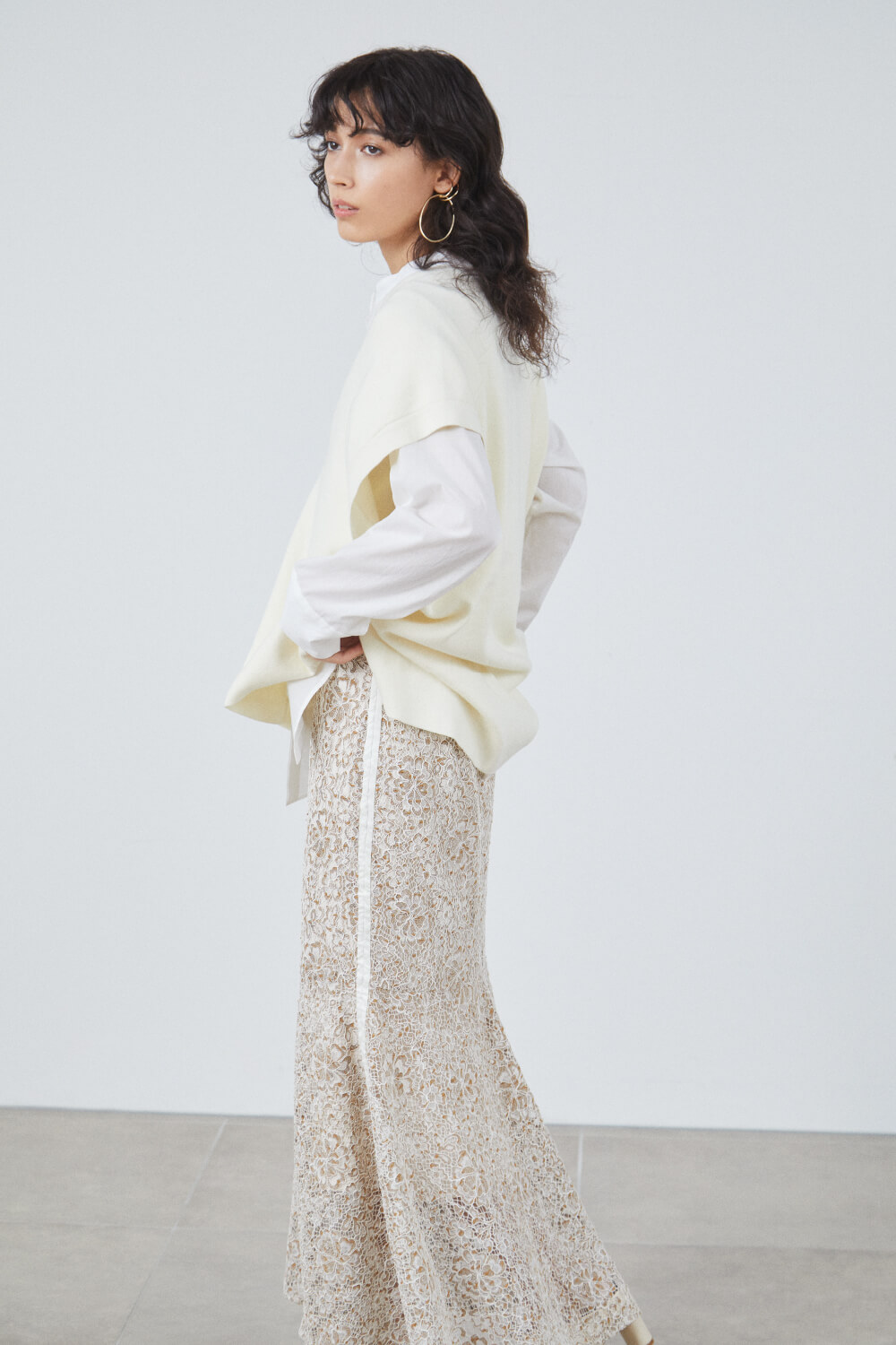 Tops ¥10,400+tax, Skirt ¥15,000+tax, Earrings ¥6,800+tax, Shoes ¥13,500+tax