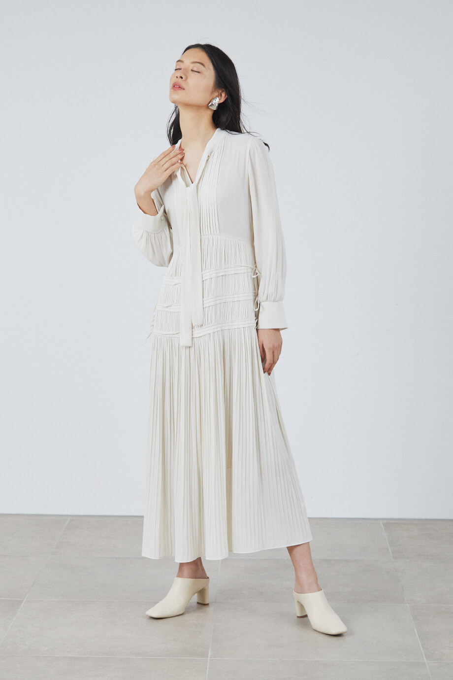 Dress ¥26,000+tax, Earrings ¥6,800+tax, Shoes ¥18,000+tax