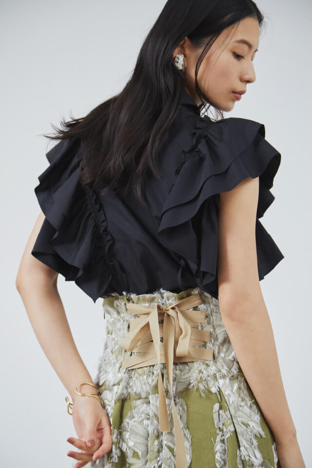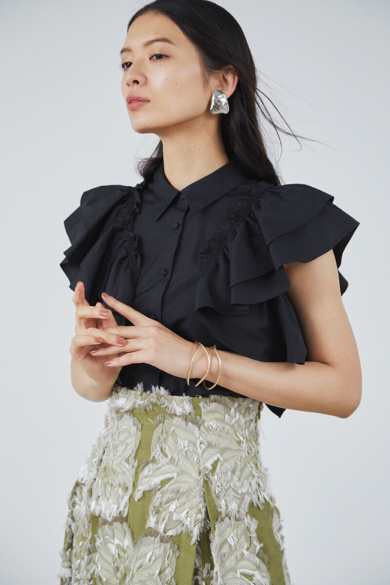Blouse ¥13,000+tax, Skirt ¥36,000+tax, Earrings ¥6,800+tax, Bangle ¥6,300+tax