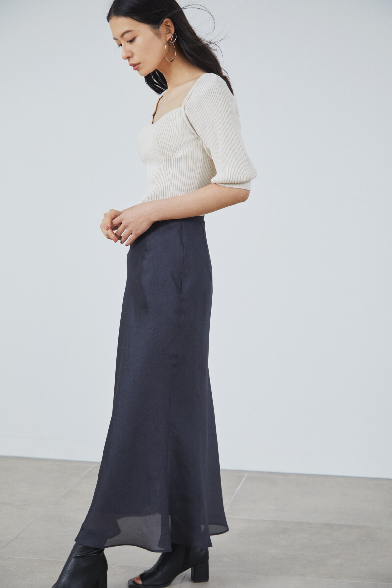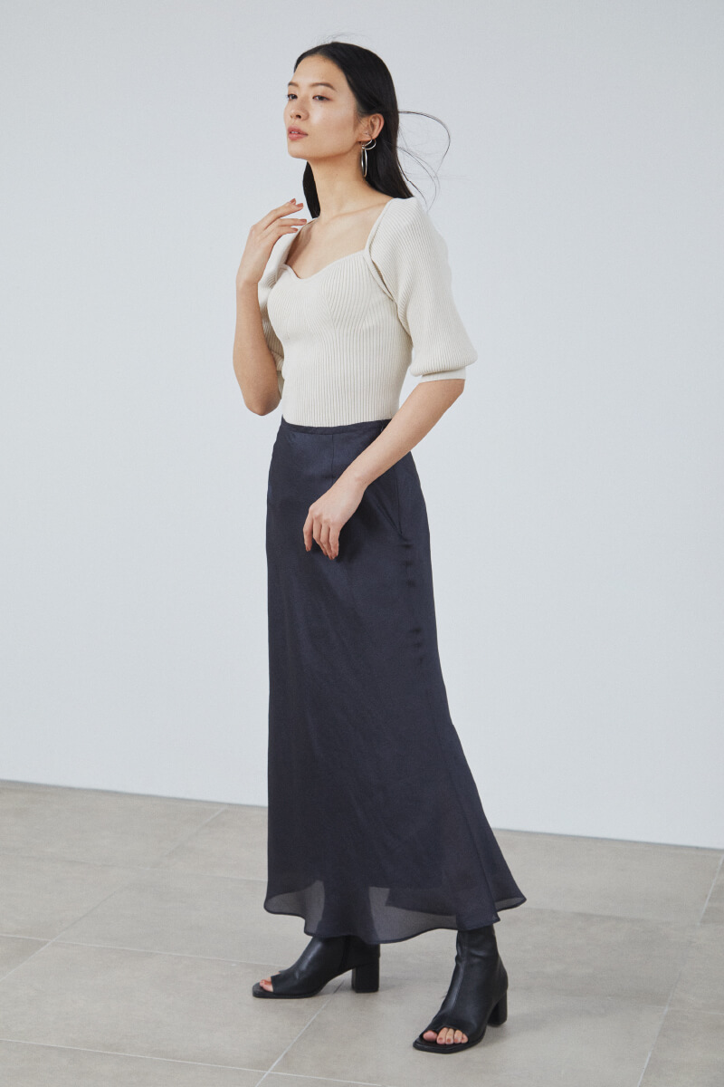 Knit tops ¥11,800+tax, Skirt ¥19,000+tax, Pierced earrings ¥6,300+tax, Shoes ¥13,500+tax