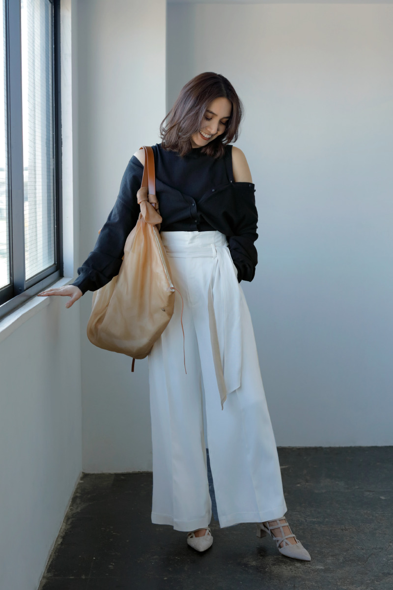 「こんなふうにヘルシーな“着崩し”ができる仕掛けがあると、その日の気分や合わせるアイテムとのバランスで着方を変えられるのでおすすめ。黒のツインニット×白パンツという組み合わせでもコンサバになりすぎず、あか抜けて見えるのもそのおかげです。今日はコーデに軽さを出すもうひと手間として、やわらかなベージュをパンプスやバッグなどで部分的に取り入れてみました」