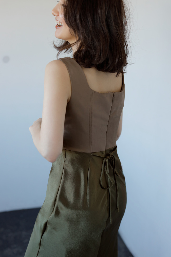 「毎年5~6月はお呼ばれも多い時季。これまでフォーマルといえば黒やネイビーが鉄板でしたが、ベーシック色ならこんな配色ドレスも奇抜にならず、新鮮で美しい。マットな質感のカーキスエード×艶やかなカーキサテンのコンビは、高級感もおしゃれ感も申し分なしです」