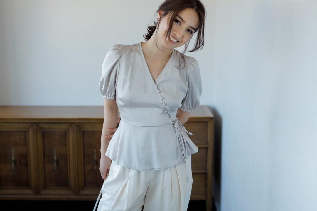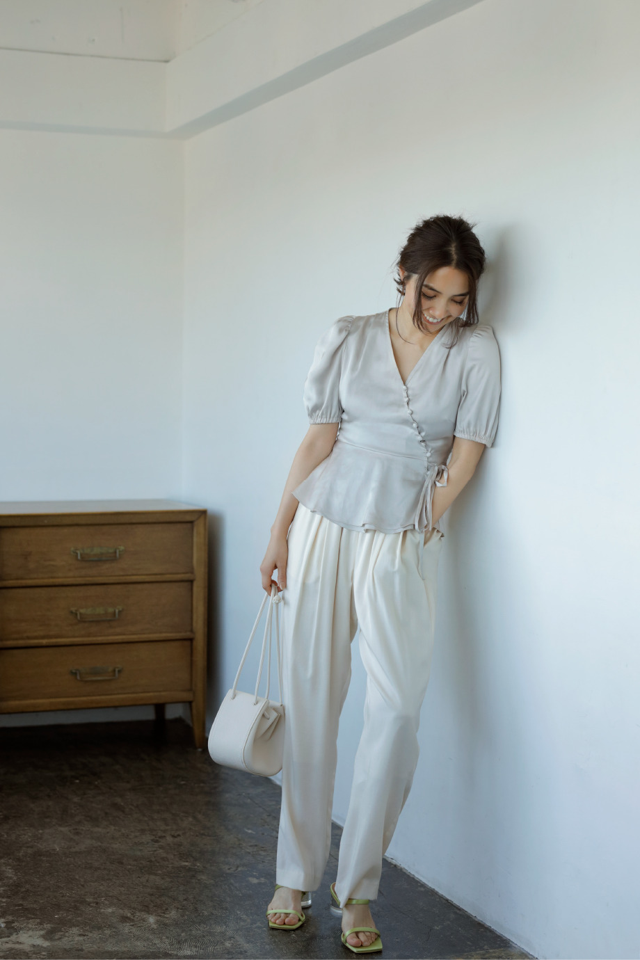 「DAY10ではワンピースでしたが、普段の着こなしにも少しツヤを取り入れるだけで、会食やオケージョンなどさまざまなシーンに使うことができます。今日のサテンブラウスもその好例。淡いグレーがかったホワイトもぐっと華やかになりますし、パフスリーブやくるみボタンのついたカシュクールデザイン、ウエストが絞られたペプラムといった女性らしいデザインも、“映え”を後押ししてくれます」