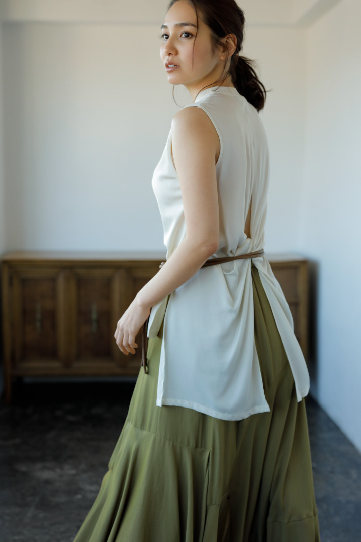 「前はドライタッチの生地、後ろにはとろみのある薄手の生地を組み合わせた異素材のトップスは、肌あたりがさらっとしていて、湿気や汗でムレがちなこれからの季節に大活躍。今年はバックシャンなアイテムが人気ですが、背中のツイストや深いスリットも可愛さと涼しい着心地を両立していて、夏には見逃せないトレンドです」