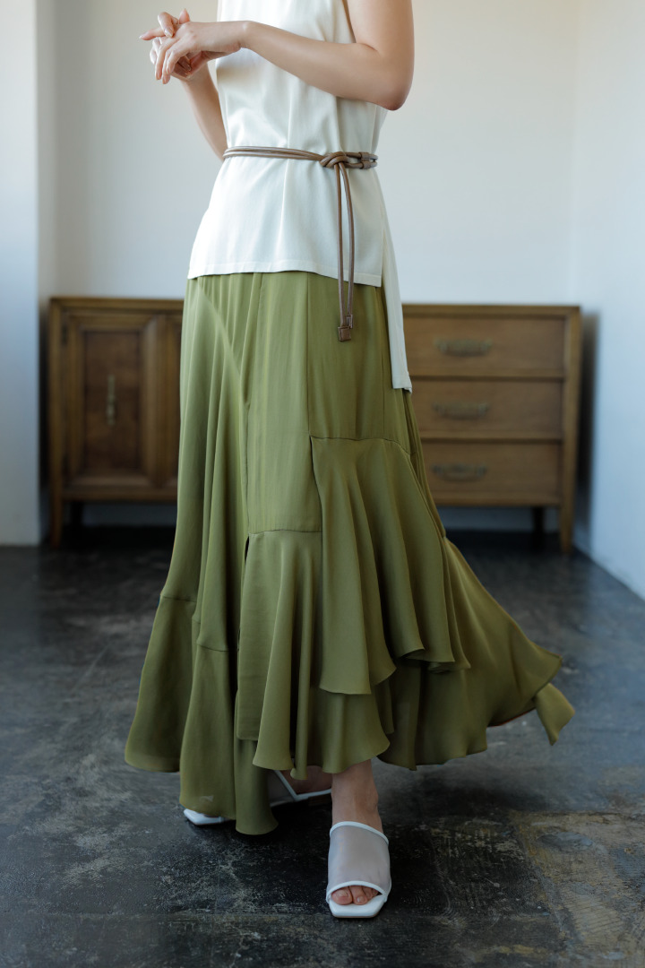 「今日はポイントにベルトを加えましたが、トップスもスカートも前後や左右ですその長さを変えたアシンメトリーなデザインなので、ロング×ロングな着こなしでも軽やかさは健在。夏を見据えて、白いシューズもそろそろ一足。あえて軽快なメッシュ素材で、ドラマチックな艶スカートをカジュアルに外してみるのも素敵です」