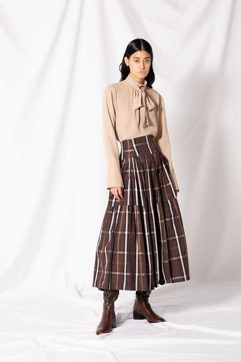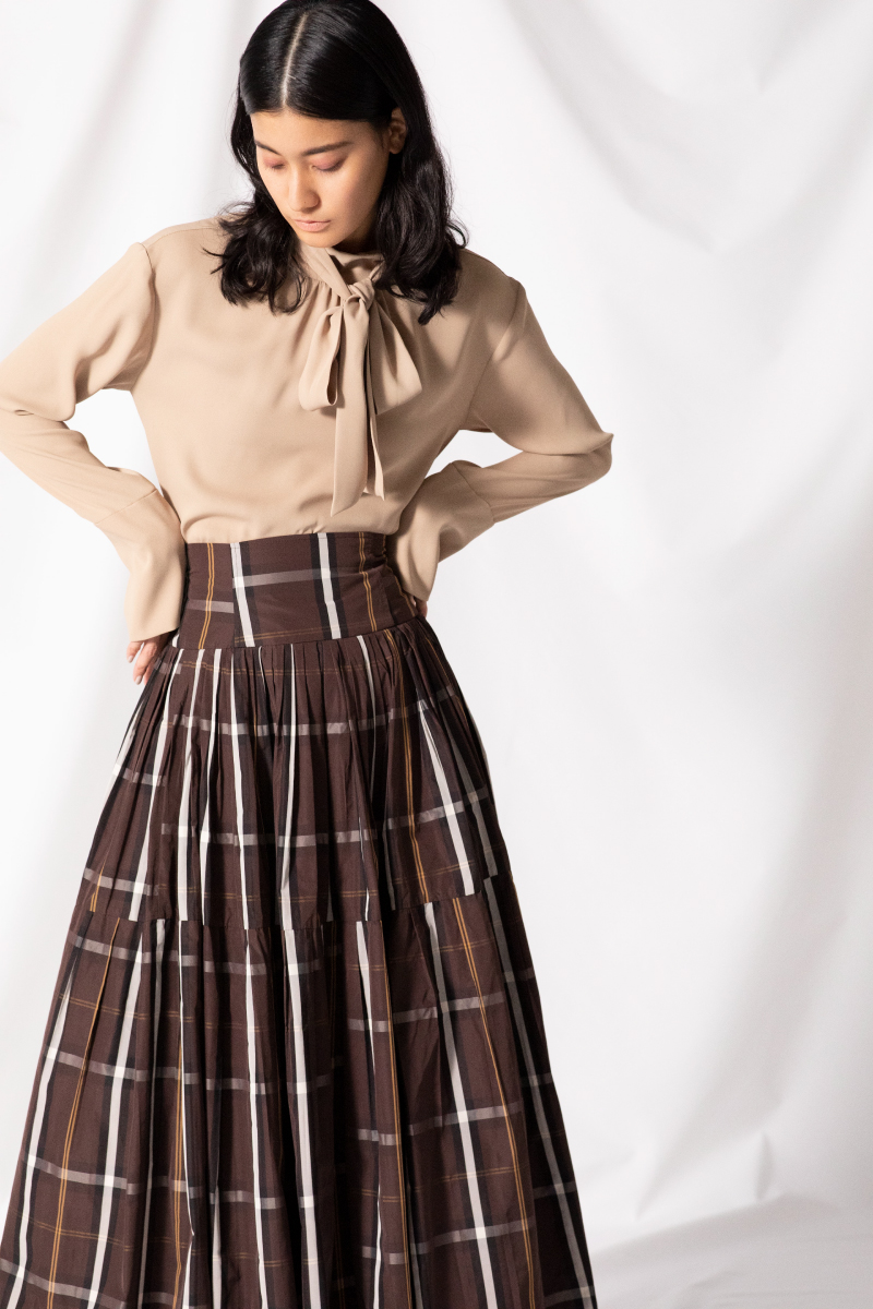 光沢感のあるタフタ生地で、きれいめなチェックながら、
