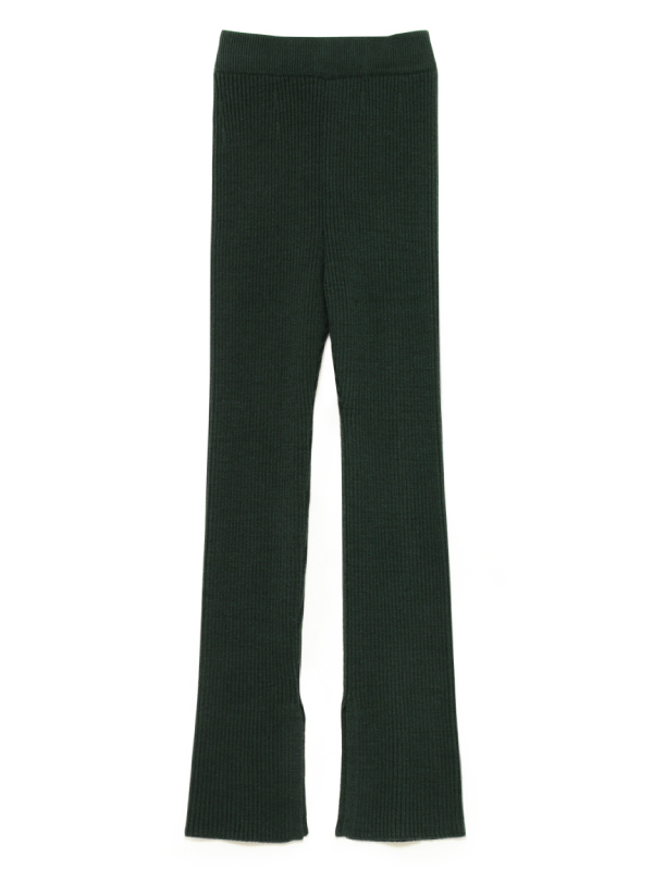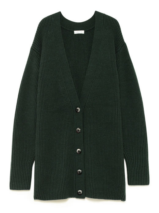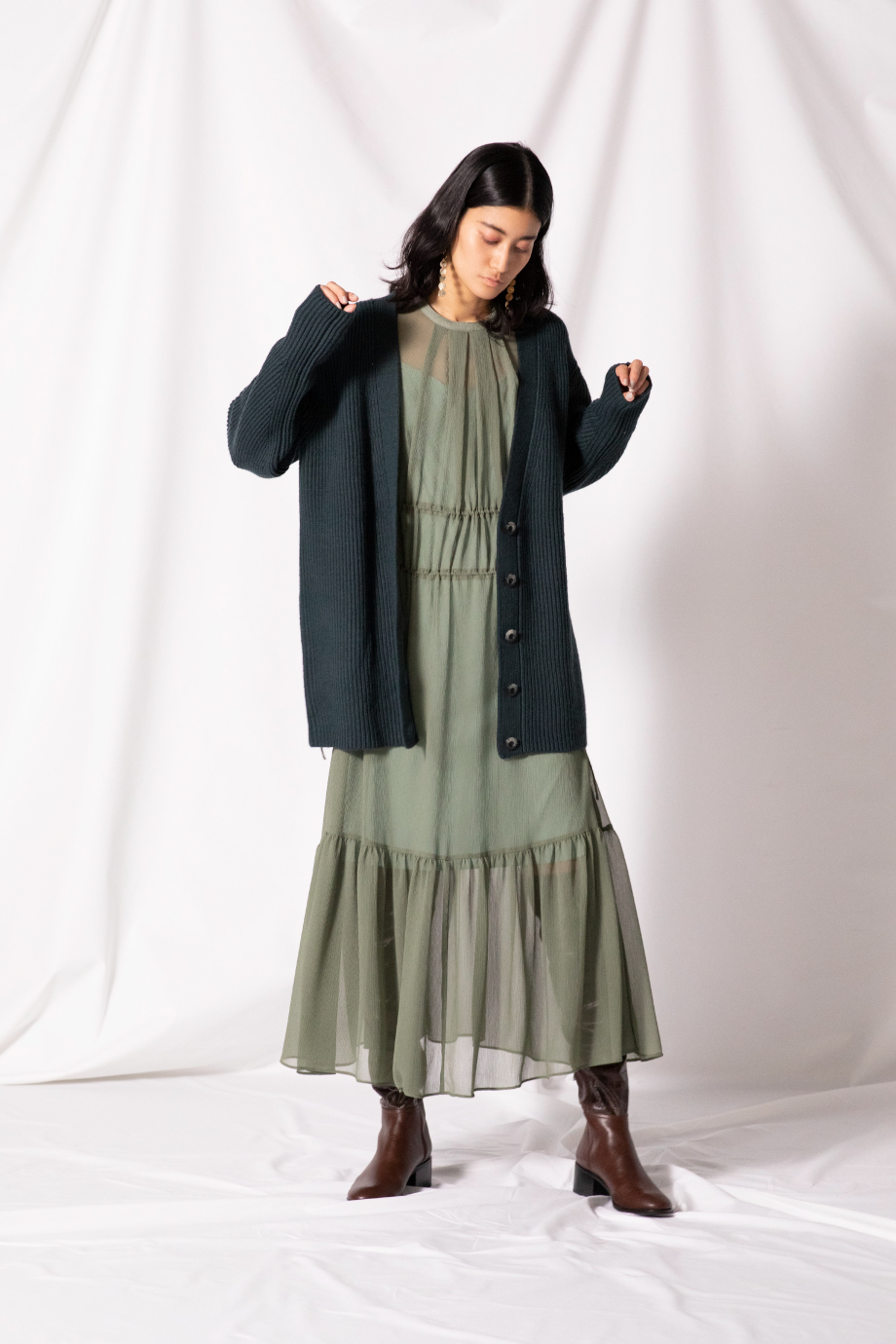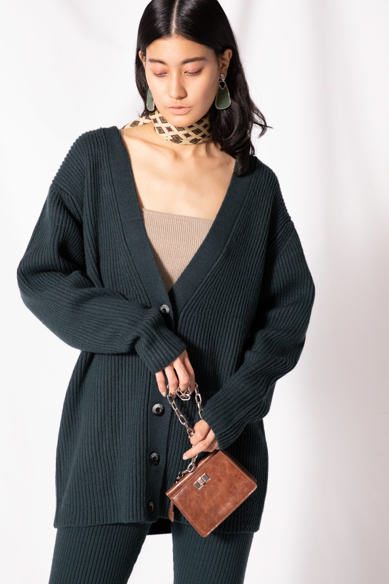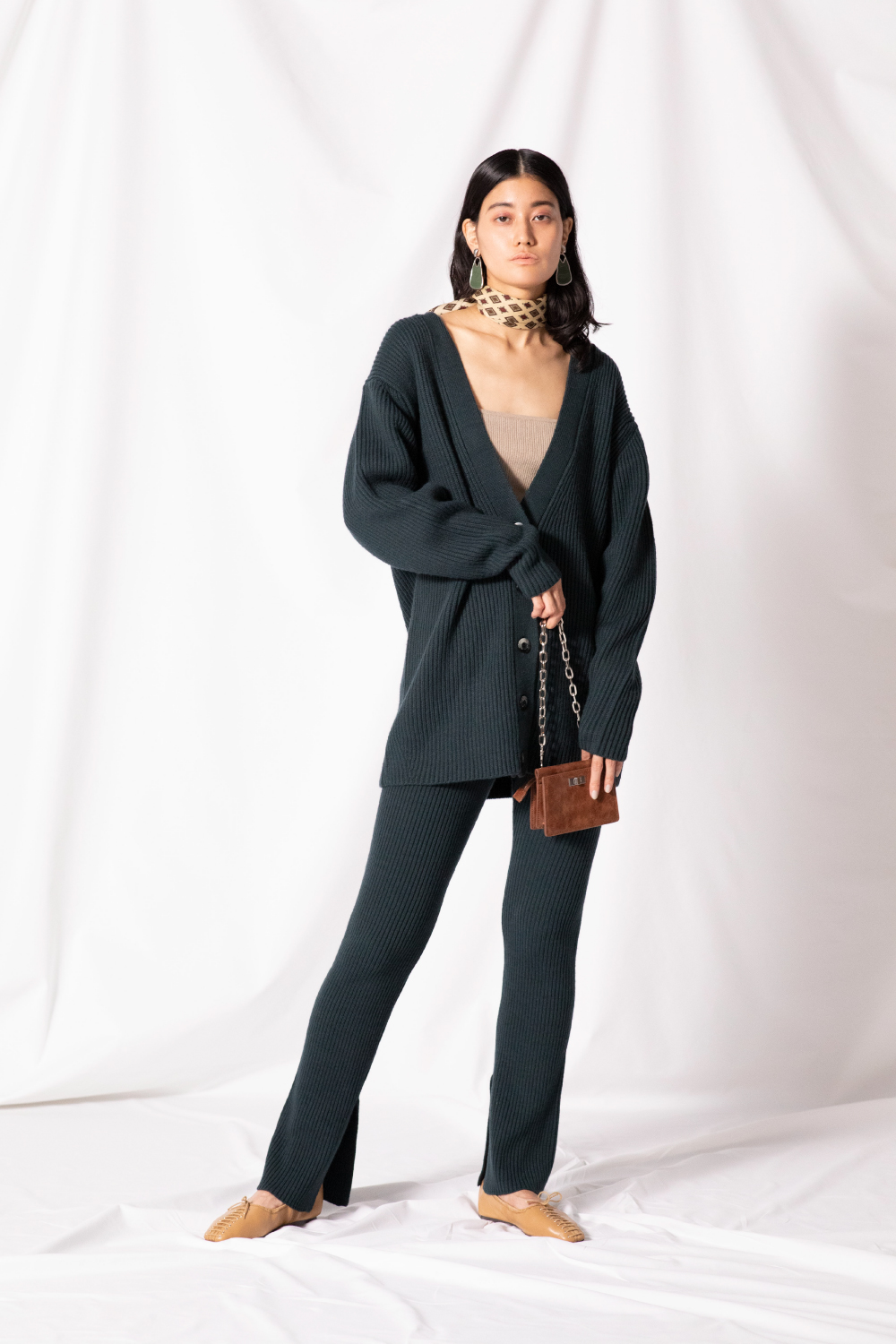 深いグリーンで染めたざっくりカーディガンとニットパンツは、