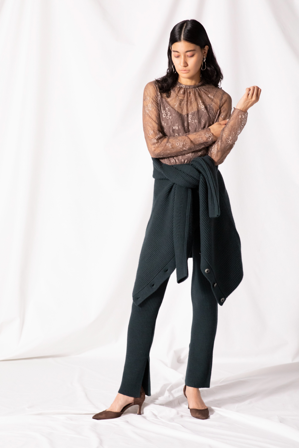 カーディガンの深いVネック、パンツの裾スリットなどの効果で、