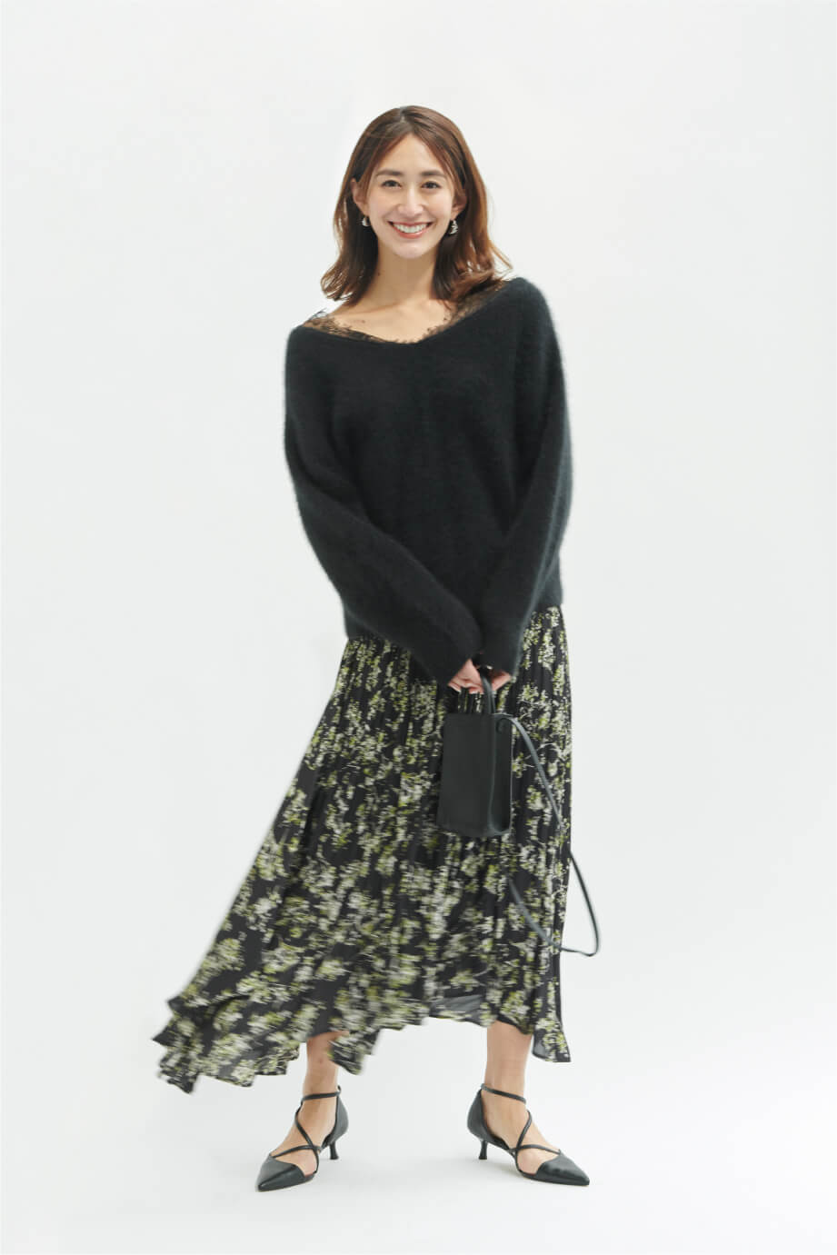 プリーツスカートを合わせて大人フェミニンスタイルに。 しなやかに揺れるスカートの柔らかさが好印象で、デートにもピッタリです。