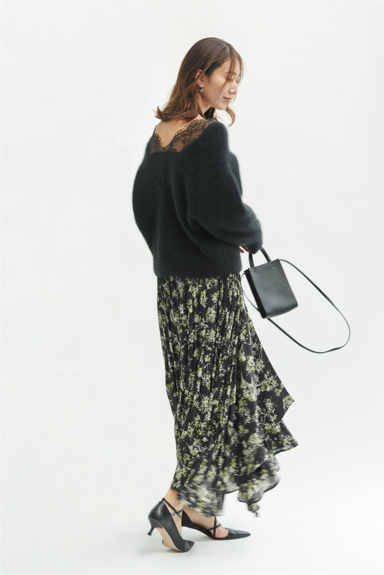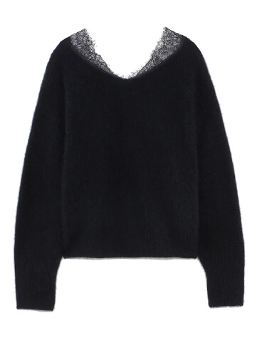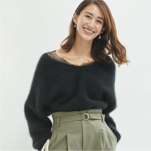 毛が抜けにくく、保温性に優れた柔らかな着心地が魅力のラクーンニット。 同色染めで濃淡をつけたレースを肩にあしらい、上品さをプラス。 ゆったりとしたシルエットが肩のラインをスッキリと見せてくれるので、華奢見え効果もあります。 大きめに開いた背中の肌見せが大人の色っぽさを演出。 スカートスタイルもパンツスタイルも、センシュアルな雰囲気をまとうことができます。