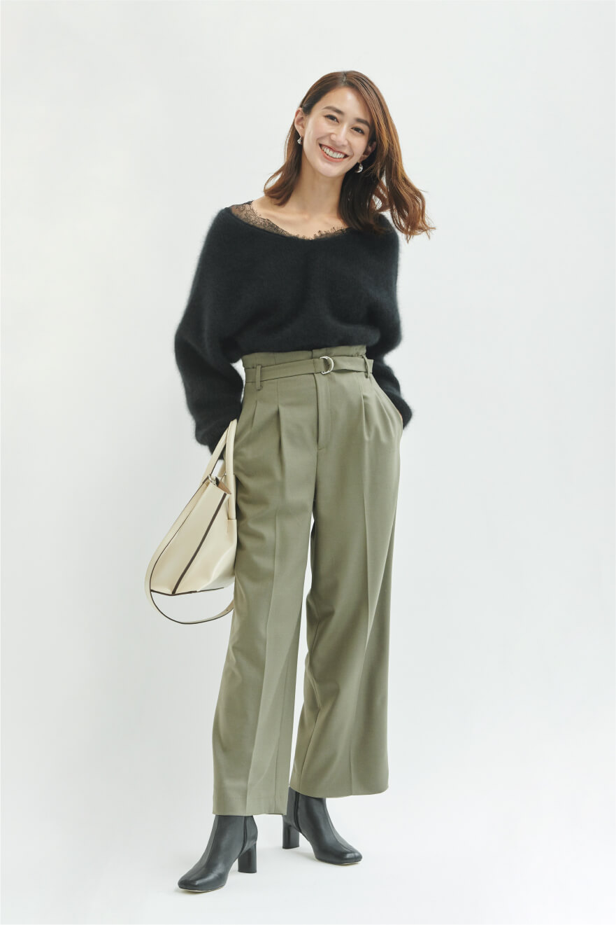 ハイウエストパンツにニットをインしてスタイルアップ。 タック入りのキレイめパンツを選べばオフィス使いにも。