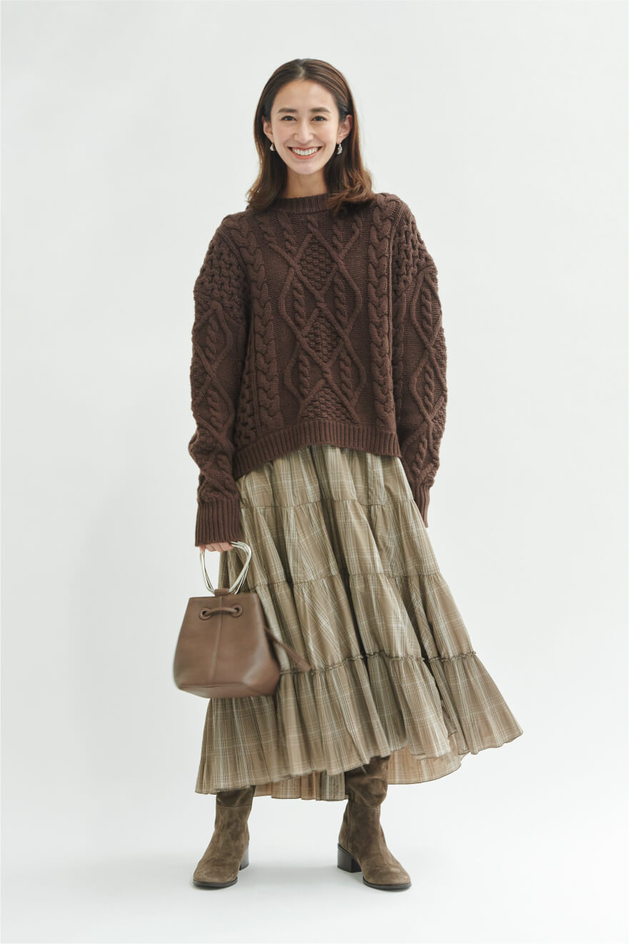 カジュアルなニットにティアードスカートを合わせてフェミニンに。 厚手のニットに合わせるスカートは、 スタイルに抜け感をプラスしてくれるふわりと揺れる素材がベター。