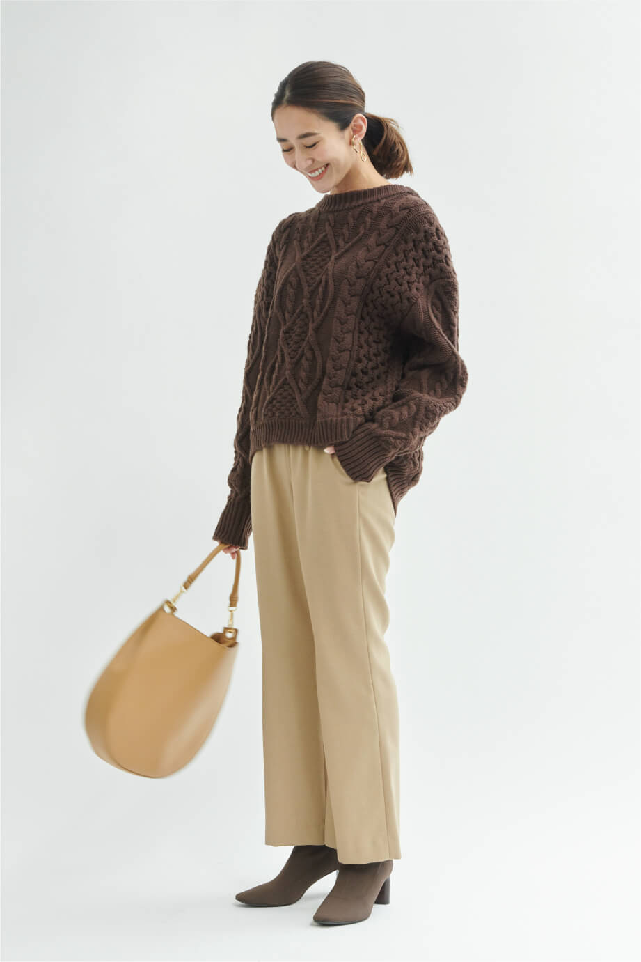 しっかりとした重みのある編み地のニットには、 あえてキレイめパンツを合わせて大人っぽく。 カジュアルなニットも“きちんと感”のある印象に仕上がります。