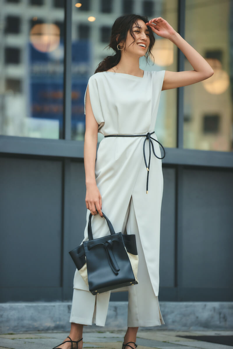 同素材の上下を揃えたセットアップスタイルは、上品できちんと感が即叶えられる大人の女性の毎日に欠かせない存在。ジャケット+ボトムの定番ももちろん素敵だけれど、この春夏は、アシンメトリーデザインのロングトップスにワイドパンツがセットになった、こんなモードなセットアップスタイルをリコメンド。美しいIラインでしっかり細見えを叶えつつ、大胆なトップスとパンツのセンタースリットで軽やかな印象もプラス。シワになりにくいポリエステル素材だから、一日中アクティブに過ごしても綺麗が続きます。