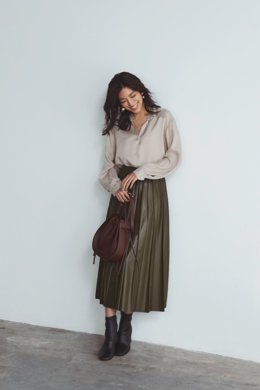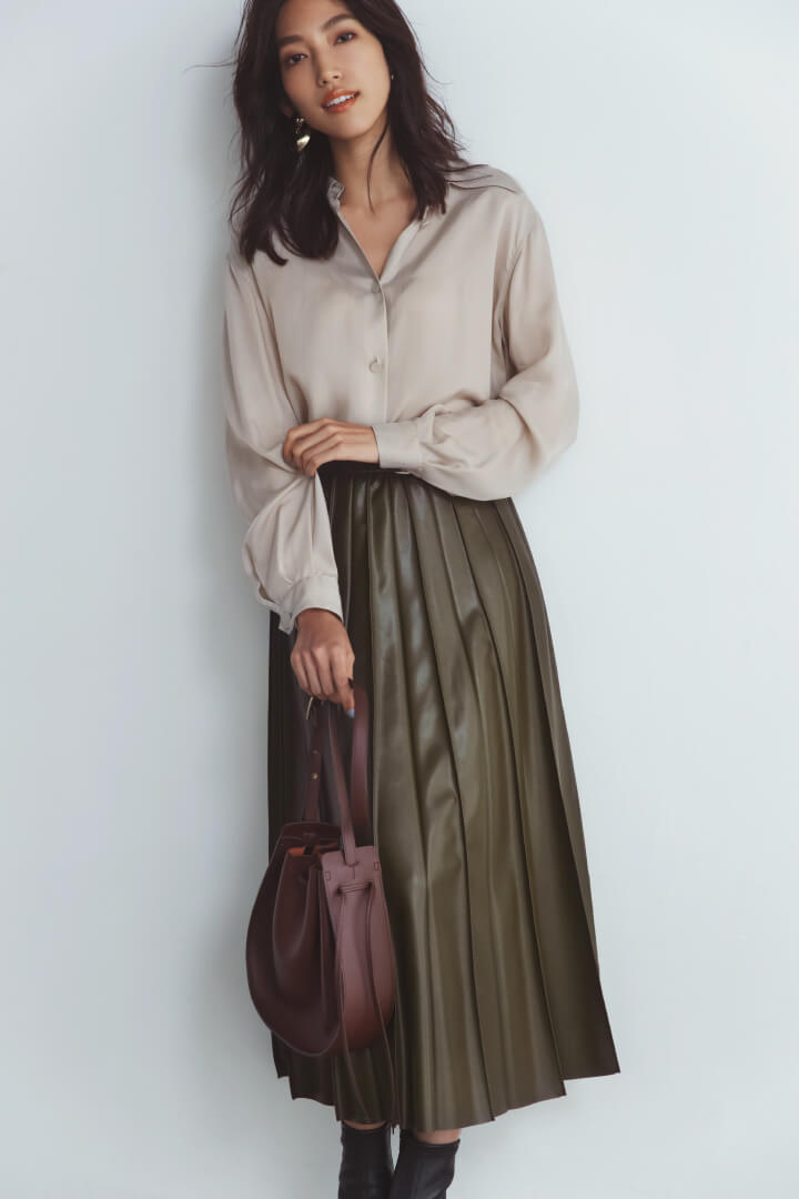 装いに艶感をプラスするサテン素材は、それだけで女っぷりが高まります。大きめの襟とふんわり袖が程よくモードを感じさせるアクセントに。今季トレンドのレザー素材のスカートと合わせれば、ソフト&ハードの奥行きあるスタイルが完成します。