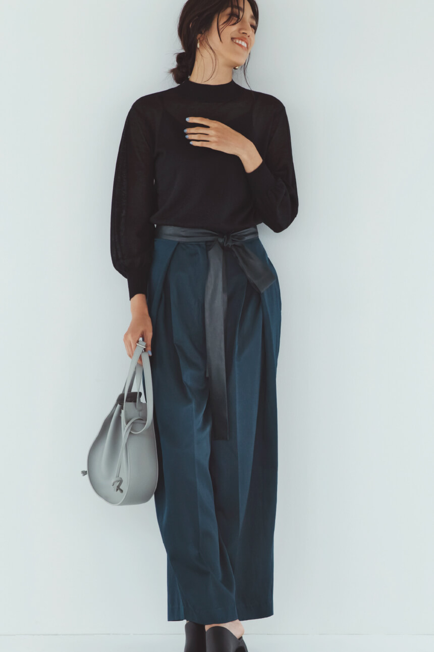 ほんのり肌がのぞくシアー素材は今年のトレンド。スタイリッシュに透け感を楽しむなら、ブラックカラーをチョイス。軽やかなトップスに、レザーリボンのワイドパンツでモードな甘さをプラスして、透け感とハード素材のコントラストを楽しんで。