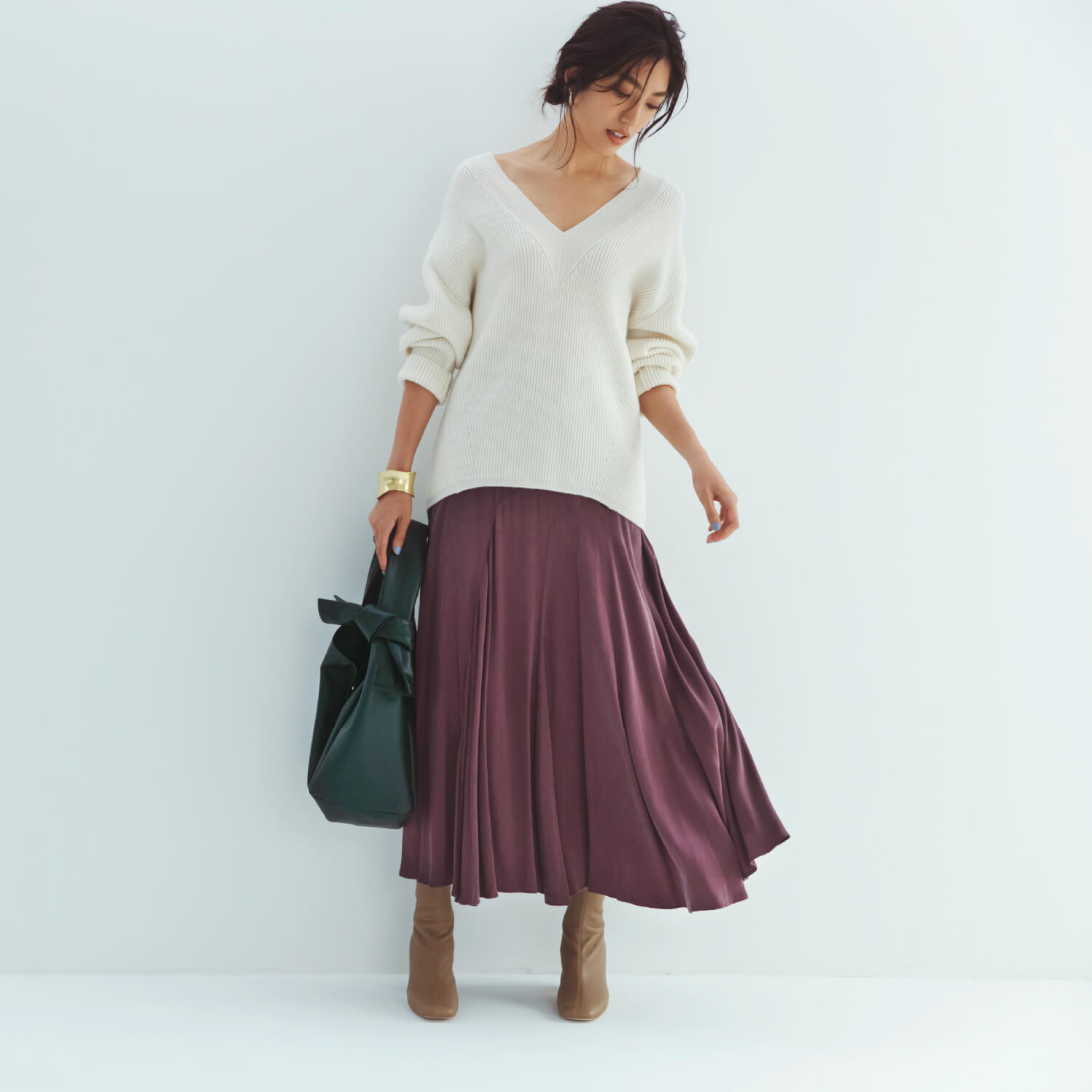 大人がシンプルなアイテムを着る時には、上質な素材を選ぶことが大切。カシミヤを混紡したしなやかなニットは、トレンドのオーバーサイズでも品のあるスタイルが叶います。広くあいたVネックラインが、ほんのり色香もプラスします。