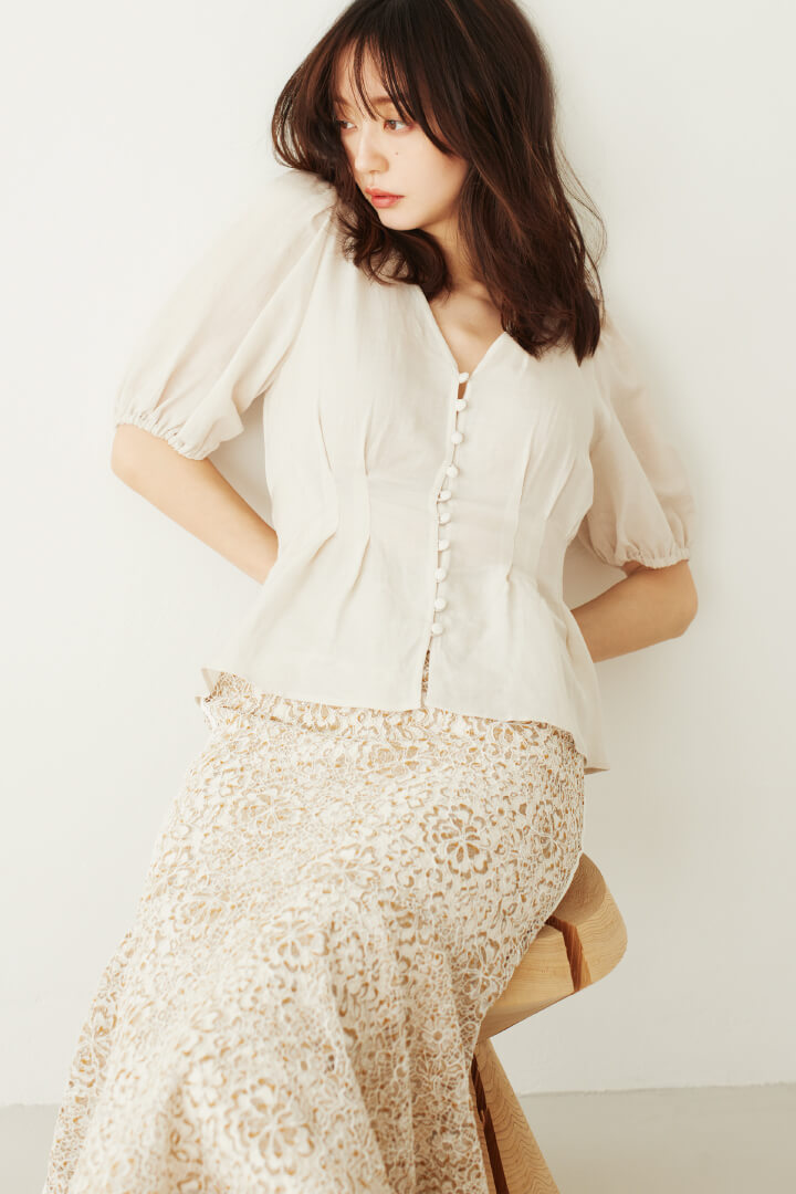 華やぎムードを盛り上げる、リッチなレースや光沢のあるビスコースリネン。体に沿うようにデザインされたリボン付きのブラウスは、女性らしいメリハリのあるシルエットを作り出してくれる立体感が魅力です。サイドにモードなラインが挟み込まれたモダンなレーススカートと共に、柔らかな質感とトーンを楽しんで。
