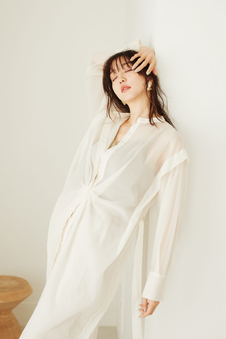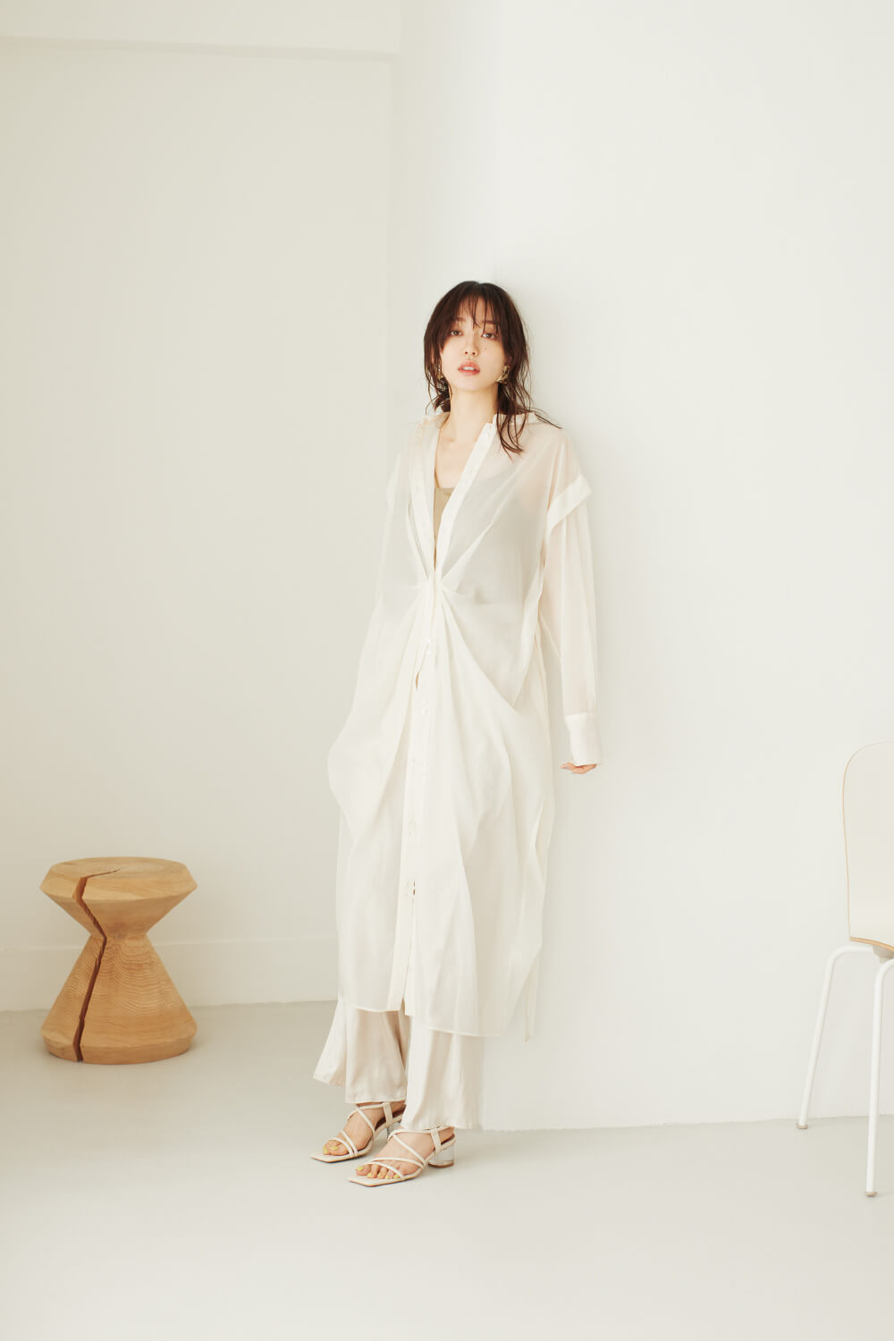 夏まで涼しげに着られる、リラクシーで清潔感のあるシアーシャツワンピース。前後とショルダーにタックが施されているので、そのままストレートに着ても、共布ベルトでウエストマークしてもモードな印象。ディテールを削ぎ落とした完成度の高いサテンパンツも、コーデのクラスアップの後押しに。