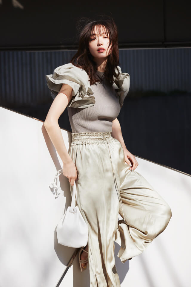 袖にラッフルフリルが施されたニットプルオーバーにグラマラスなサテンパンツを合わせた、自然と気分を上げてくれる最旬スタイル。パンツのウエスト周りにたっぷりギャザーが寄せられているのでトップスINもキマりやすく、ラグジュアリーなバランスを損なうことなく特別感のある着こなしを楽しめます。