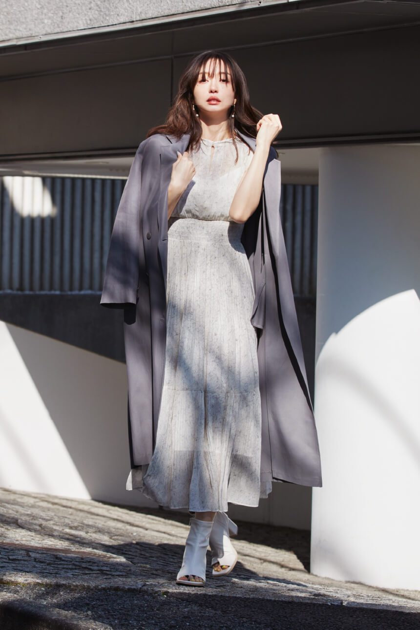 精巧なラインアート刺繍が施されたシフォンワンピースに、人気のダブルブレストコートを着流すように羽織った、大人のムード漂うスタイル。ドラマティックに裾が広がるワンピースは、ゴムシャーリングで高め位置にウエストが設定された脚長を叶えるフレアシルエット。柔らかなワンピースもアセテートコットンのコートも、シワになりにくいのが嬉しい。