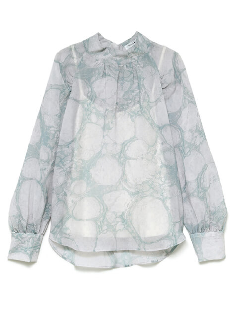 去年人気を博したハイネックブラウスに、今シーズンのオリジナルプリントを施しリバイバル。程よいボリュームの袖と、ラグランラインのギャザーが女性らしいシルエットを作ります。透け感のあるさらっとしたポリエステル素材に水面の様なマーブルプリントが映え、ボトムを選ばず、洒落た着こなしを叶える一枚です。
