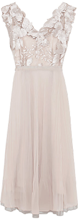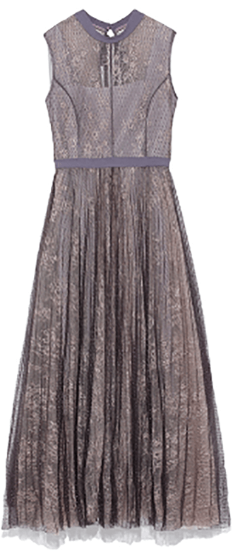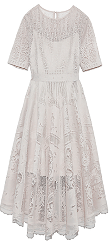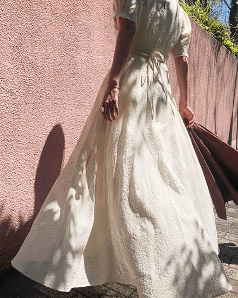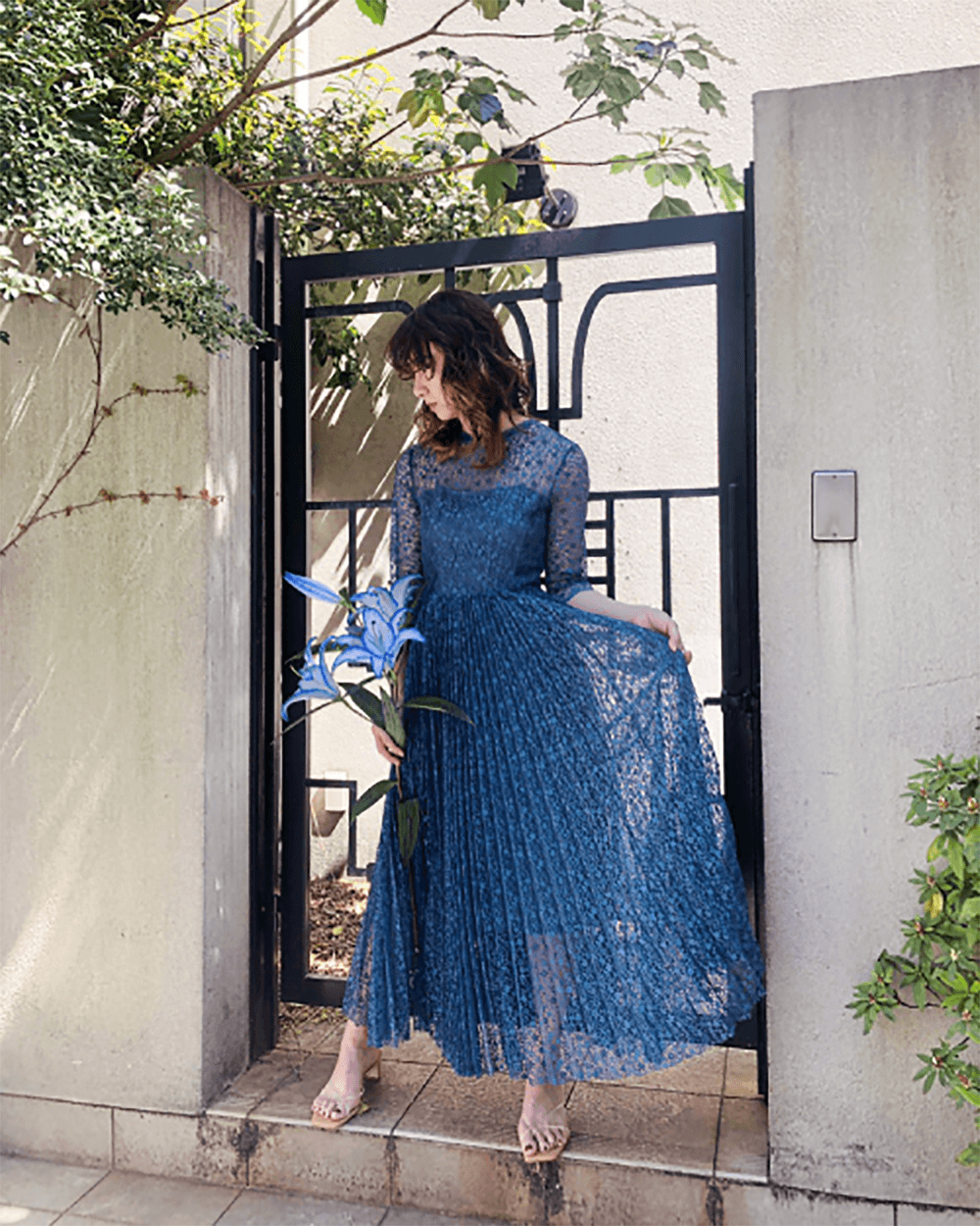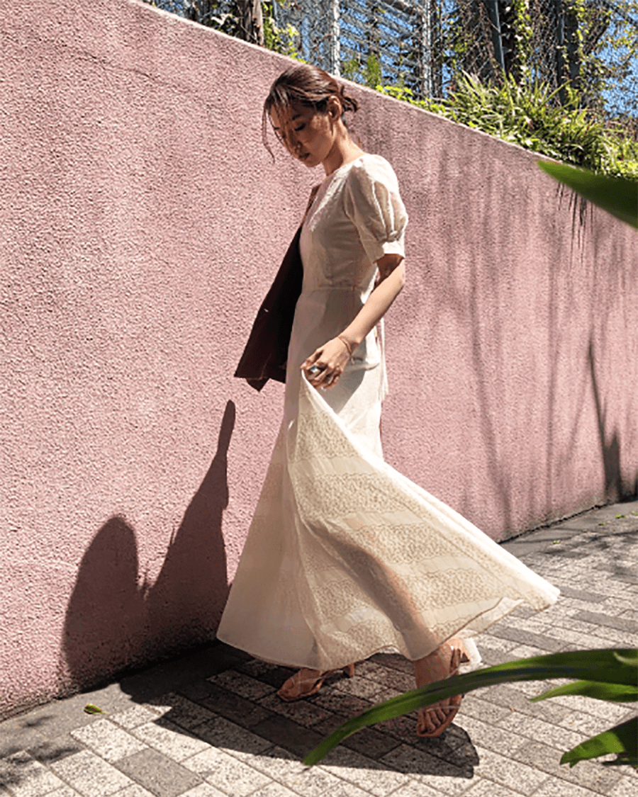 贅沢にあしらった刺繍はディテールまで美しく、品格を上げる。 素材に陰影を作るから、太陽の下ガーデンパーティでも 繊細な立体感を見せ、華やいだ印象に。