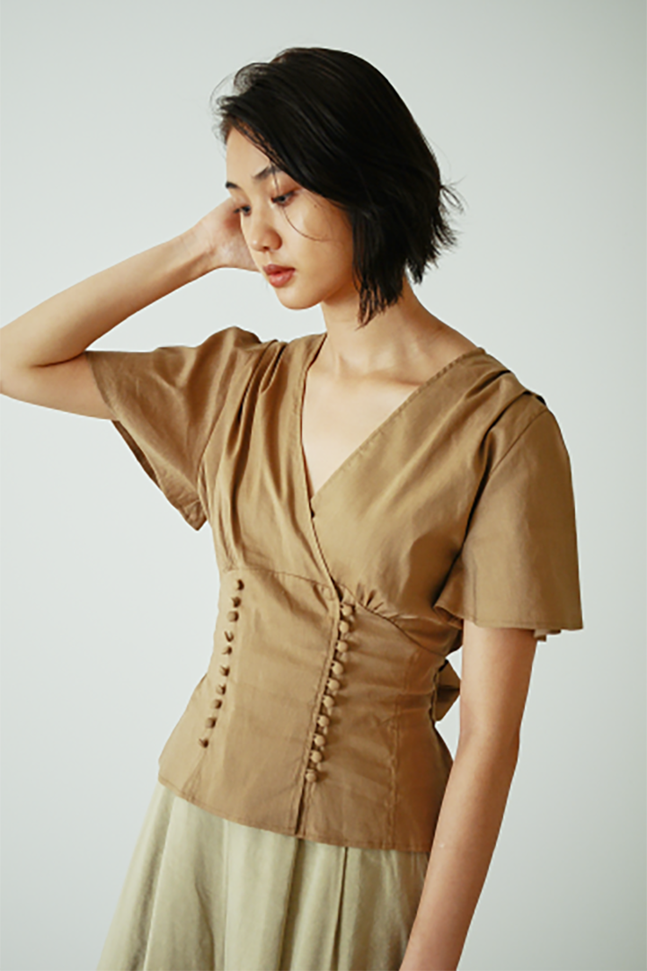 フロントのボタンデザインでヴィンテージ感がプラスされ、 より大人な印象にアップデートされた人気のカシュクールブラウス。 フレアスリーブで腕周りをカバーし、デコルテを美しく見せる、 オンオフ使える万能トップスです。