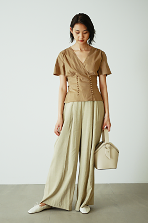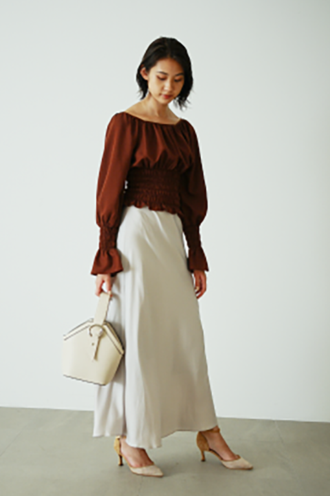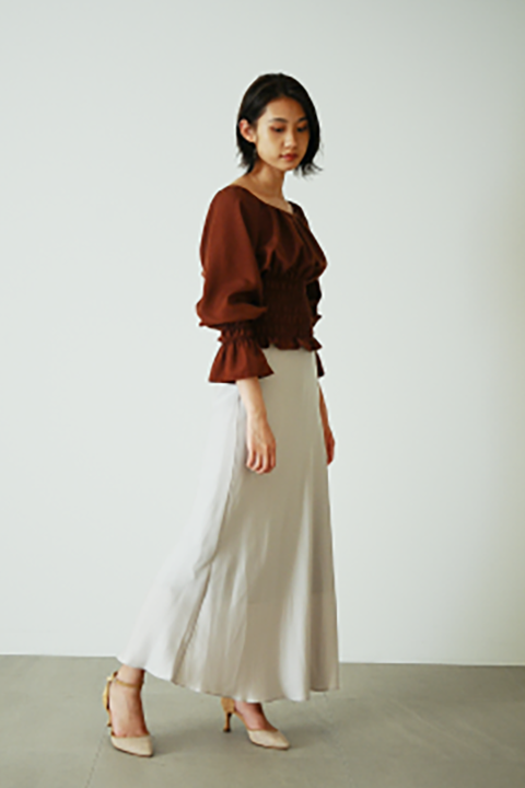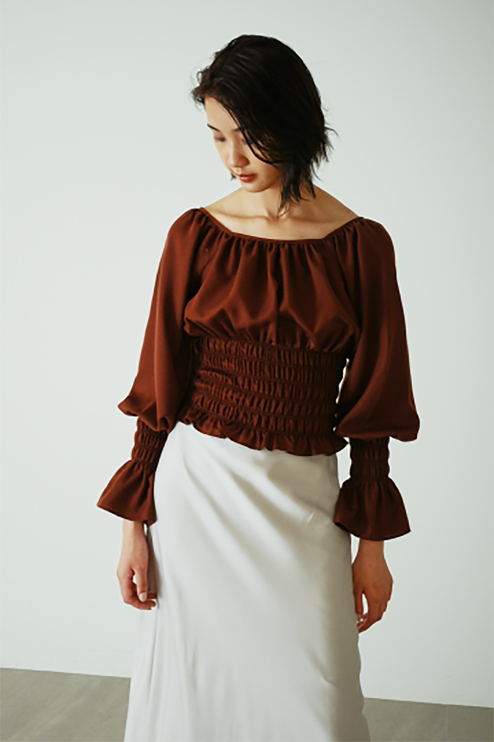 ウエスト、手首のシャーリングとボリュームスリーブが作る 女性らしいシルエットのブラウス。スカートパンツ問わず合わせやすく、 トレンド継続のナロースカートとも好バランス。