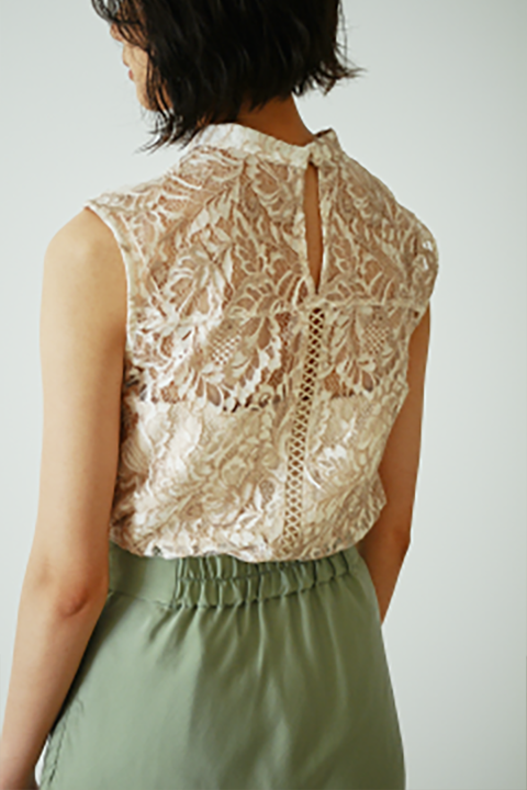 華やかなレースのアクセントに梯子レースが施され、 バックスタイルも抜かりなく、一枚で上品な肌見せプラス、モードな印象も。 秋からはカーディガンやジャケットに映える インナーとして、シーズン長く使える一着です。