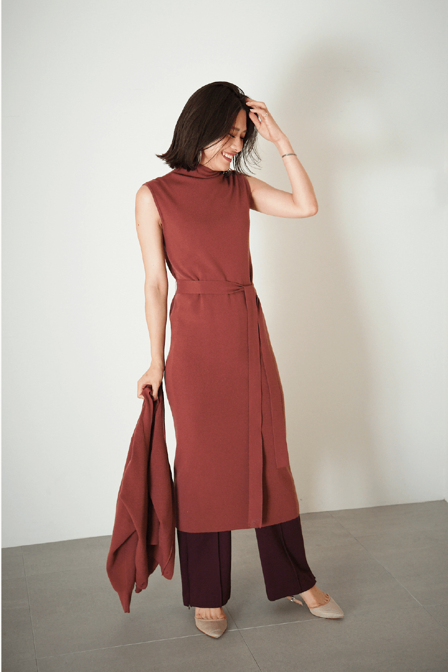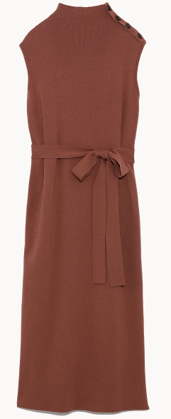 シルエットがきれいなニットワンピースは、パンツ合わせもしやすい丈感で1枚でも、着回しもできるアイテム。