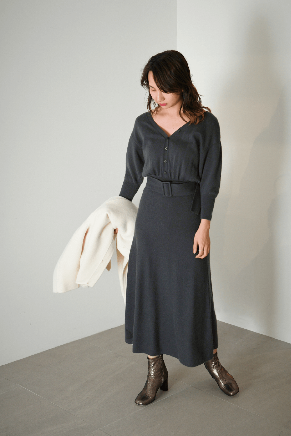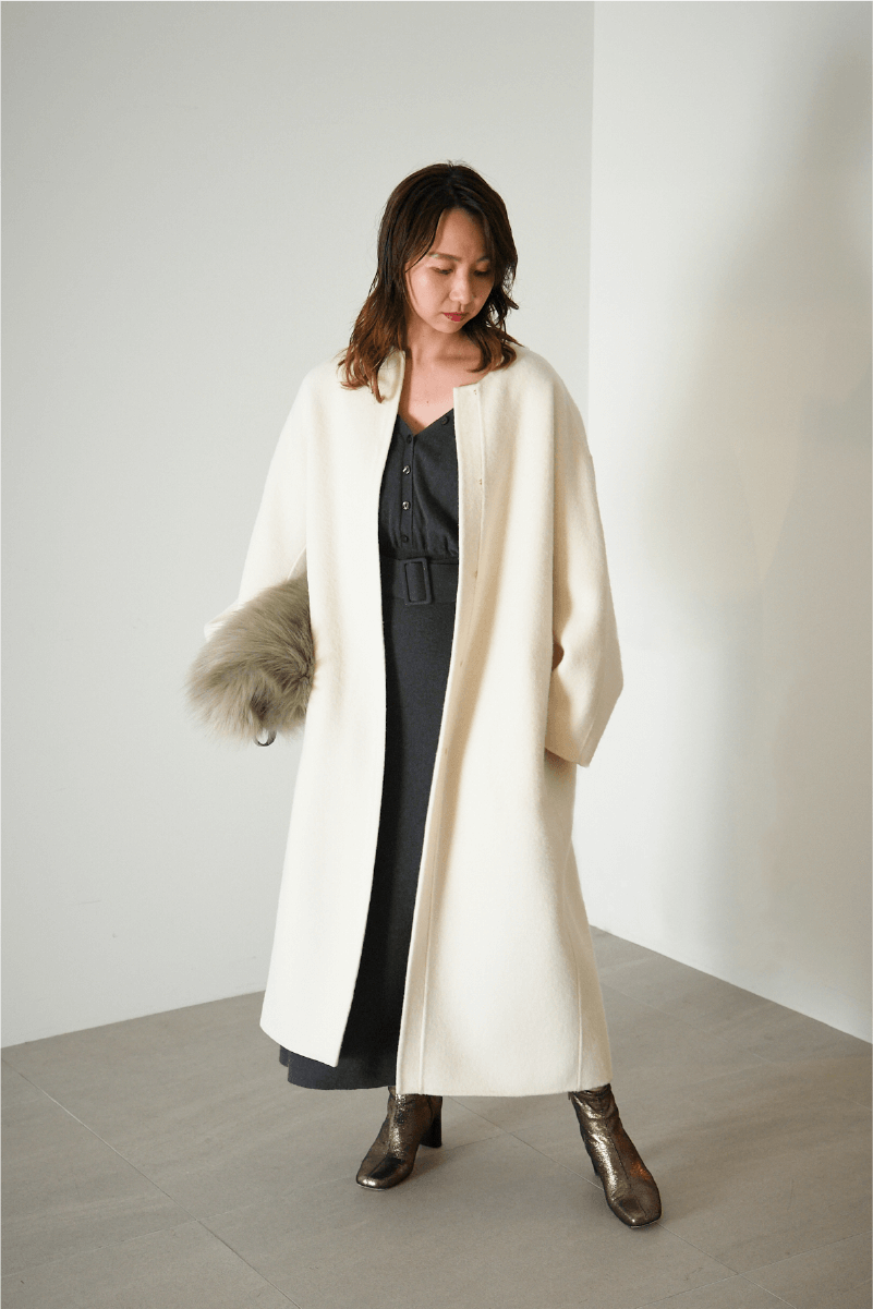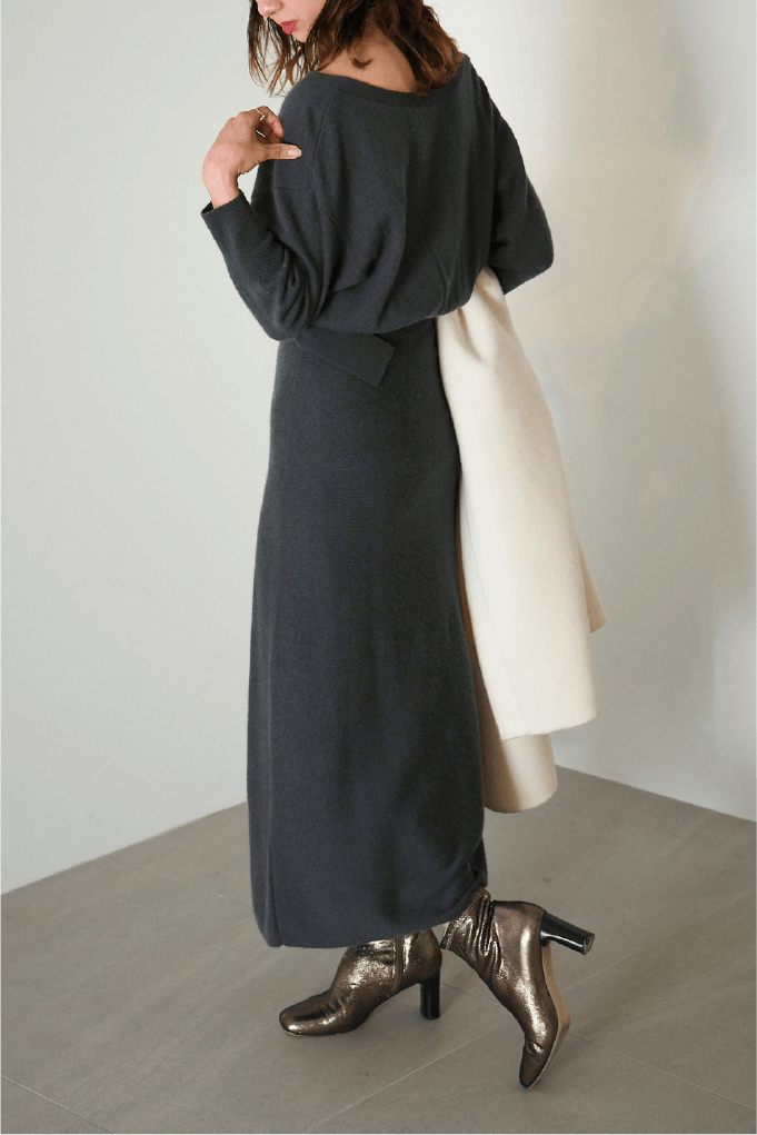 暖かく上質なウールカシミヤ素材で、コートに合わせ真冬まで活躍してくれます。足元にブーツや、ファーバックなど小物の合わせで、オフィスシーン以外にも使えるワンピースです。