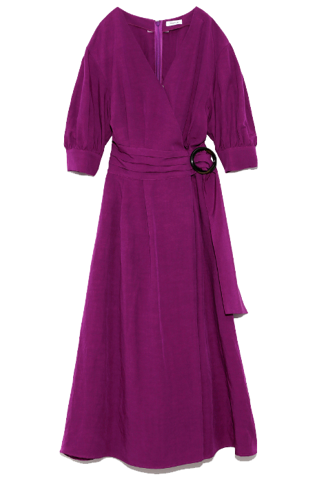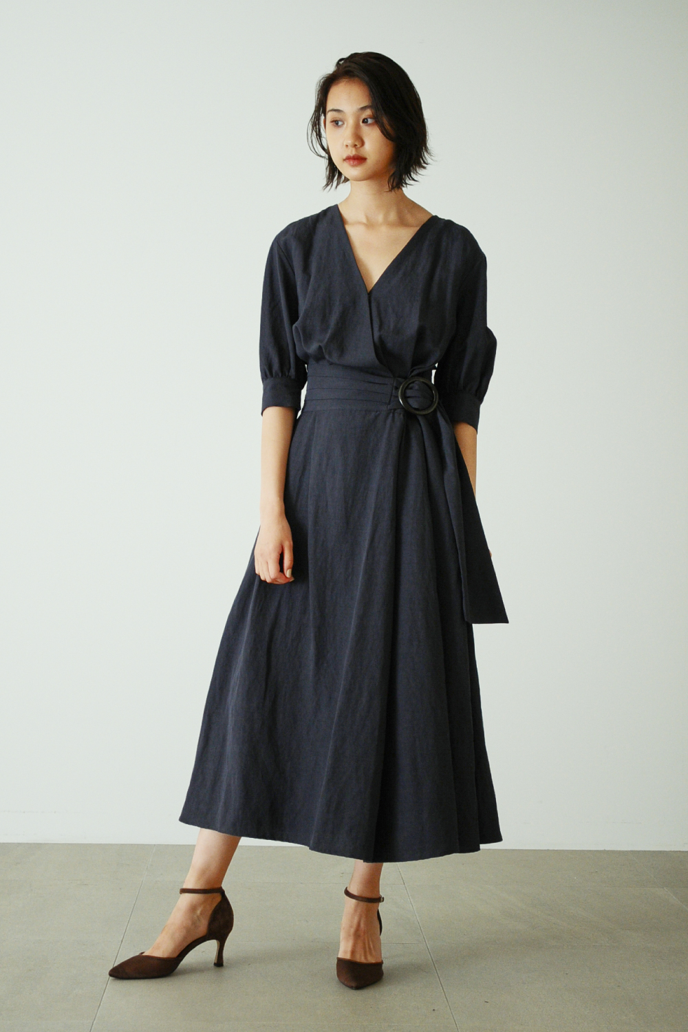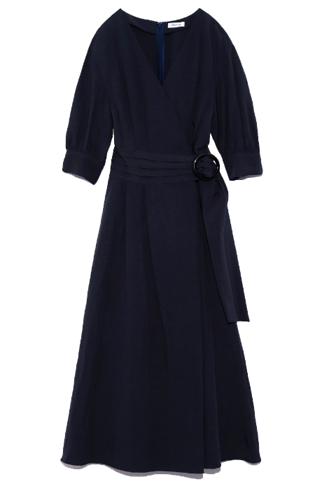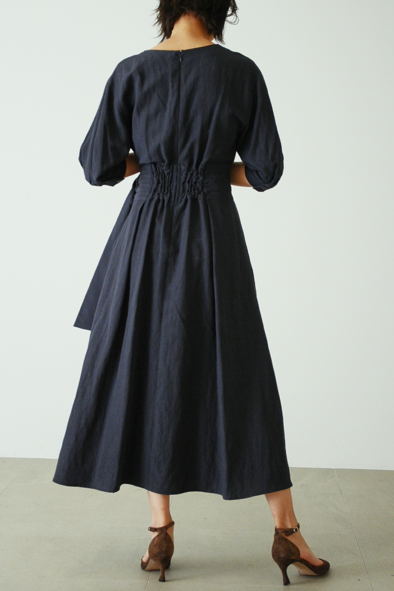 きっちりベルトを巻いた様なデザインでも、後ろはウエストギャザーで締め付けず、着脱しやすいファスナー仕様。涼しくなってきた今の時期に丁度良い、五分丈のパフスリーブは気になる腕周りもきれいにカバー。スナップボタン付きで、胸元も気にせず着られるカシュクールデザインです。
