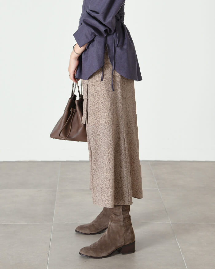 デザイントップスまで幅広いスタイリングに対応する万能プリントスカート。