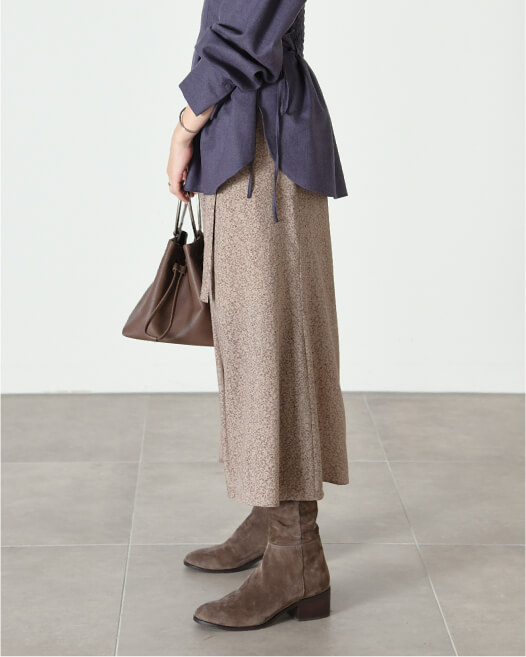 後ろ丈が長く、前丈が短いのでサイドの見た目も美しく、歩きやすいロングスカートです。